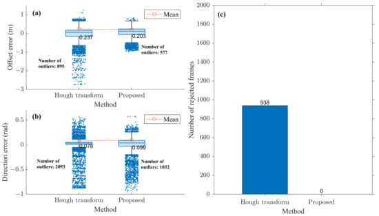 The error of the proposed method and the Hough transform method for dataset 1: (a) offset error; (b) direction error; (c) number of rejected frames. Note: The red circles in (a,b) represent the corresponding absolute average error, respectively.