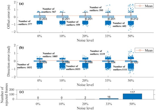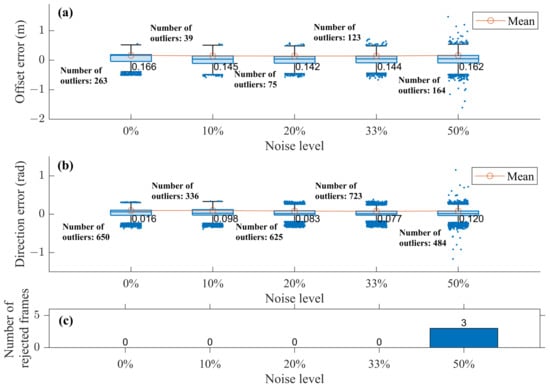 Then, we add different levels of noise to each frame of LiDAR data in dataset 1, and the statistical results of error are shown in Figure 12. It can be seen that (1) adding different levels of noise does not affect the absolute average offset error, but when adding 33% and 50% of horizontal noise, it has a greater impact on the outliers of the offset error, and as the noise level increases, the outliers are increasingly scattered (Figure 12). (2) Adding different levels of noise has a greater impact on the absolute average direction error (Figure 12b). In addition to this, the number of rejected frames increases to 117 frames when 50% noise is added (Figure 12c). (3) Adding different levels of noise has little effect on the number of discrete points of offset error and direction error (Figure 12a,b). From the perspective of adding different levels of noise, the proposed method has better robustness.