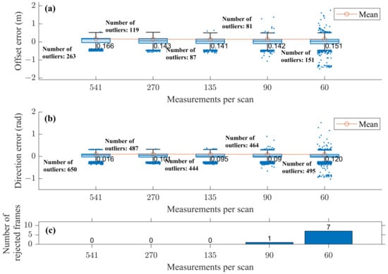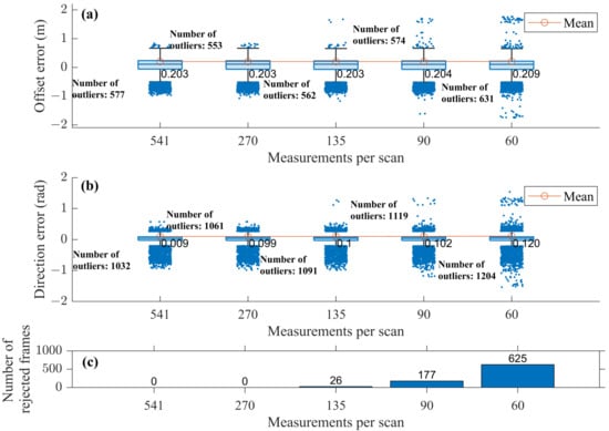 Below, we randomly reduce different levels of data for each frame of LiDAR data in dataset 1. Figure 13 shows the statistical result of the error. It can be seen that (1) the law of reducing data at different levels is essentially the same as the law of adding noise at different levels, and the direction error is more sensitive than the offset error. (2) When removing 3/4 of the original LiDAR data—that is, the number of LiDAR data points per frame is 135—the number of rejected frames gradually increases (Figure 13c).