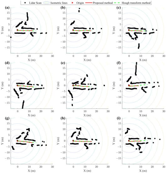 Dataset 2 only refers to the straight driving mode, but there are more and more complex intersections than dataset 1. We adopt a map resolution of 0.5. Below, we extract nine feature frames from dataset 2 (Figure 14). The LiDAR data collection positions in Figure 14a–i correspond to points a-i in Figure 3c. It can be seen that the proposed method is essentially the same as the local path plan using the Hough transform method, and both can find the centerline of the current driving laneway.