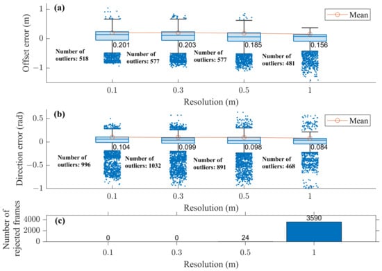 In this section, we discuss the performance of the proposed method under different map accuracies through datasets 1 and 2. Figure 19 shows the results of the proposed method after processing dataset 1 at different map resolutions. It can be seen that (1) with the increase in the map resolution, the absolute average offset error and the direction error both show a decreasing trend, and the fluctuation degree of the error is slightly smaller, but a few outlier errors increase (Figure 19a,b). (2) When the map resolution is 0.5 m, rejected frames begin to appear, and when the map resolution is 1 m, the number of rejected frames reaches 3590 frames, which is approximately 25% of the total number of frames in dataset 1 (Figure 19c).