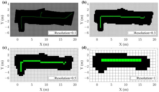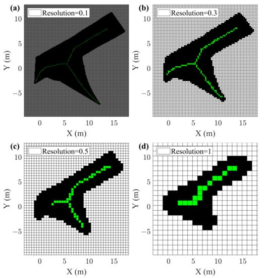 Secondly, as the resolution of the map increases, dataset 1 has a small number of outlier errors, while dataset 2 has no such situation. Figure 22 is a binary map and its skeleton of the LiDAR data corresponds to Figure 10b under different map resolutions, and the corresponding driving mode is a right turn. It can be seen that as the map resolution increases, the path to the right becomes shorter and shorter until it disappears completely, and the error corresponding to Figure 22d is the largest. Therefore, in turn mode, the greater the map resolution, the greater the error. Since the LiDAR data in the turning mode of dataset 1 have 3607 frames, as the map resolution increases, their corresponding error will increase, and there will be few outlier errors in the dataset. Meanwhile, dataset 2 has no LiDAR data in turn mode, so this does not occur.
