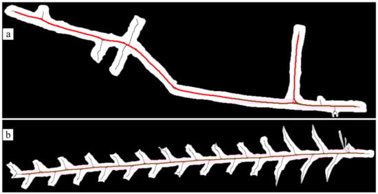 The underground laneway is a corridor-type structure, and the centerline of the laneway can be used as the driving path of the vehicle. The proposed method belongs to the image-based path planning methods; therefore, the proposed method can be used for global path planning for underground mines. Figure 23a,b show the global paths extracted using the proposed method in the maps corresponding to dataset 1 (Figure 2d) and dataset 2 (Figure 3a), respectively. The resolution of the maps is 0.2 m. The red line in the figure is the centerline of the main laneway extracted using the proposed method.