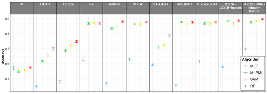 In most cases, RF was the most accurate method; only for S2 and S2+LiDAR, SVM and MLP, respectively, were the most accurate. However, in both cases RF cannot be considered significantly less accurate than those methods, as their confidence intervals overlap. In all cases the accuracy of the baseline model was significantly lower than that of the machine learning methods, except when using just S1 data. In this case Maximum Likelihood accuracy is not significantly lower than RF’s and both are significantly higher than SVM’s and MLP’s.