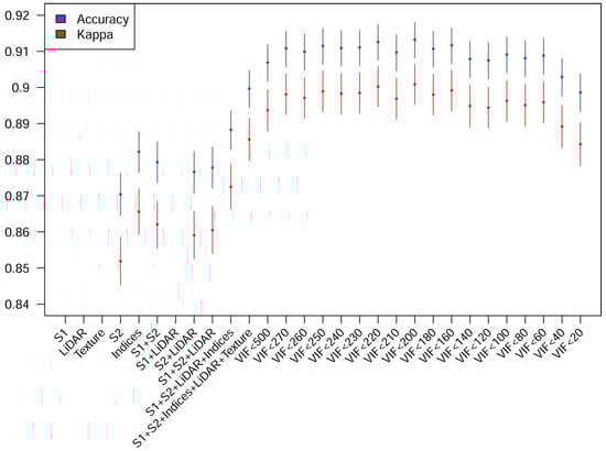 As the highest accuracy is reached using all datasets and RF, the next step is to try to select the best subset of predictors to achieve a similar, or possibly better, accuracy. The first step is to use VIF to eliminate collinear predictors. Instead of choosing a fixed VIF threshold, several values were tested to calculate the resulting accuracy. Figure 3 shows the results corresponding to accuracy and kappa with the 95% confidence intervals. Although non-significantly higher accuracies were reached with larger thresholds, 160 was the finally used VIF threshold as it represents a step increase in accuracy with respect to smaller threshold values. The smaller the threshold, the smaller the number of features. This threshold means a reduction in the number of features from 126 to 84.