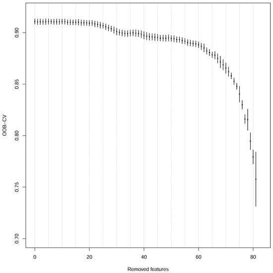 Because of the high number of features (126) and the high probability of multicollinearity among them, feature selection was advisable. The Variance Inflation Factor (VIF) is a feature selection method commonly used to detect collinear features. It was calculated for the predictors used in the best of the prior classifications. It estimates a linear model to predict each feature using the rest as predictors and computes its . The higher the VIF, the more collinear the feature. We calculated VIF in a recursive manner, eliminating in each step the feature with the highest VIF until all VIFs are smaller than a threshold. There are no rules of thumb to establish such as a threshold. Researchers in recent decades have suggested that this threshold should be established with caution, taking into account other factors that may have influence the variability of predictors [103,104]. We tested several thresholds and calculated the resulting OOB-CV accuracy using the SDRF function.