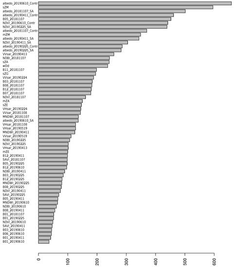 Although RF is not usually the most accurate machine learning (ML) method, it has several advantages [86,87,88,89,90,91]: (1) It is robust in case of high dimensionality, correlated features, small sample sizes or outliers. (2) It is possible to obtain a ranking of the importance of the features by measuring how the accuracy decreases when a feature is randomly reshuffled while the rest remains unchanged. (3) It is possible to evaluate the effect of the features in the model that can then be used as an explicative model, not only predictive. (4) It is possible to compute the distances between pairs of cases that could be used in an unsupervised classification. (5) It is computationally lighter than other ML methods, especially taking into account that it is not very sensitive to the values of the parameters, significantly reducing the computational cost of its calibration. (6) It provides an internal accuracy metric called Out-Of-Bag Cross Validation (OOB-CV) that has been considered an unbiased estimate of generalization error, provided that the training data are unbiased and randomly sampled. However, the authors of [90] highlighted that to calculate OOB-CV, RF internally splits each training polygon and uses its pixels both for training and testing. As pixels belonging to a single polygon are usually quite similar, the reported OOB-CV accuracy is easily overestimated. Ref. [90] proposed a modification of the algorithm (Spatial Dependence Random Forest—SDRF) to divide whole polygons, instead of pixels, into in-bag and out-of-bag.