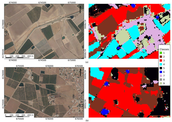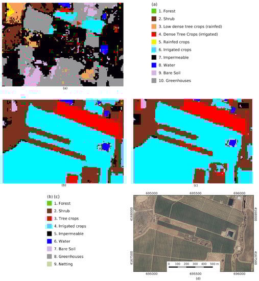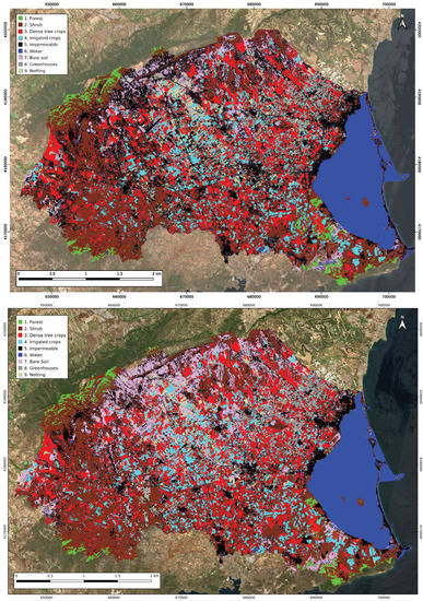 Training areas were digitized using the aerial ortophotography from the Spanish PNOA [74] acquired in 2016 and 2019. A stratified sampling design was conducted to guarantee a reasonable presence of all classes. Representativity for the set was enhanced using Isolation Forest with the methodology proposed in [82], resulting in a total of 131 polygons, distributed as shown in Table 4. The classification scheme adopted was decided grouping land covers in the study area. Netting is a class related with recent agricultural practices that produces spectral responses different from those of greenhouses or irrigated crops. It consists of covering trees using nets with diverse mesh sizes to prevent both insects and birds from eating the fruit, and to protect from hail damages. Although some residual rain-fed areas exist in the study area, they are not included in the classification scheme because most of them are in a process of transformation to irrigation or being abandoned. In both cases their spectral signatures are similar to bare soil areas. We prefer to classify them as bare soil or scrub, as their surfaces are not in production any longer and are usually susceptible to a change of use.