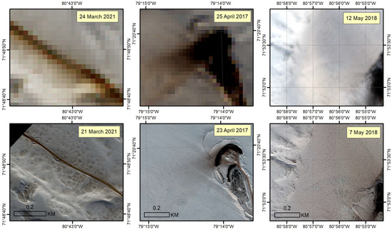 Dust plumes observed from Landsat and WorldView images, in the top and bottom panels, respectively, in RGB color composites around Mine’s facilities. The left panels show dustfall around the tote road; the middle panels show dust plume around the mine pit and the right panels show dust deposition over the sea ice and snow beside the ore stockpiles in Milne Inlet.