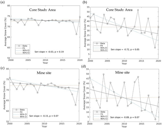 Second, a pixel-wise M-K test is applied to the average snow cover during winter and snowmelt seasons, respectively. For the pixel-wise M-K test, we repeat the test for different periods (all starting from 2000 but ending in different years) in order to identify the year that a significant trend appears. We limit the ending year from 2013 to 2020; this ensures that the length of the period for the M-K test is long and the M-K test covers a few years before the Mine’s operation.