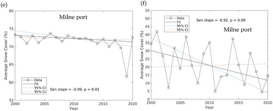 Figure 1e shows the daily average snow cover for the core study region (big blue box in Figure 1c) over the 21-year period; here, the daily average snow cover is calculated as the mean values of all the valid (no-cloud) pixels for a specific day, the resulting 21 data points are for each date of the year. There are no data prior to 1 March for this northern Arctic area. Three periods can be separated: the winter period (1 March to 11 June) when the snow cover is stable, the quick snow melting period (12 June to 8 July), and the post-melting period (days after 8 July). Transient snow cover events were noted in the post-melting period but the snow does not remain long as both air and ground surface temperatures are already relatively high. There are increasing trends of snow cover from 1 March to 11 June in the winter period; the increasing trends are likely caused by the accumulated snow that gradually covers relatively high areas, e.g., tall grasses, shrubs, and rocks. As these trends are consistent and stable and we are comparing snow covers among different years, we believe that the data can still be used for trend analysis when we separate the time series into winter and melting periods. This can be confirmed by Figure 5a as the trend of snow cover in winter has remained fairly uniform during the last 21 years; the lower snow cover in 2019 was due to the unusual warming in the Arctic as 2019 was the second-hottest year recorded since 1900. In contrast to the winter period, the snow cover in the snow-melting period (spring time; Period II; Figure 5b) has a significant decreasing trend of −0.72% in NDSI snow cover (p < 0.05). Our result is in line with the finding in northern Finland based on snow measuring stations that the decreasing trend of snow depth was most evident in spring, but no change occurred during winter months [47]. Similar trends of snow cover are also found for the Mine site and the Milne Inlet Port in Figure 5c–f as indicated in the small blue boxes in Figure 1c.