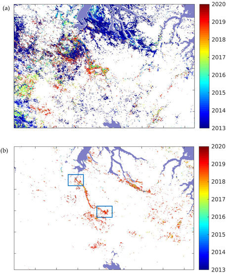 Figure 6 shows the first year a negative trend is detected for each pixel (but not the intensity of the trend). For the spring season (Figure 6a), extensive negative trends already appeared before 2015, especially in the low-altitude areas (Figure S1); since 2016, negative trends around the Mine site started to appear. For the winter season (Figure 6b), most negative trends start after 2017; the location of the Mine, port and tote road is clearly revealed, and these negative trends appear to align with the mining operations. Other areas are also noted to demonstrate a negative trend in snow cover.