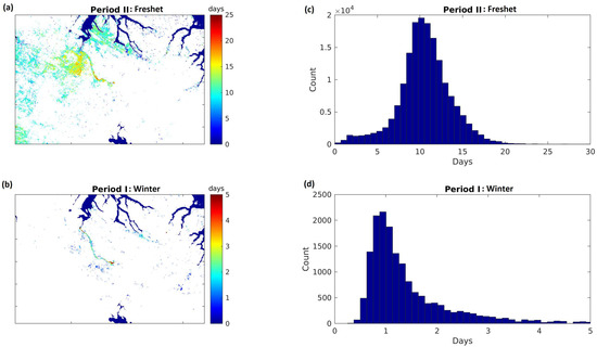 Advanced snow-off days since 2000 as estimated from snow cover changes (a) for the snowmelt season and (b) for the winter season; the histograms for (a,b) are shown in (c,d), respectively. Areas of coastal water are masked in (a,b) using deep blue color.