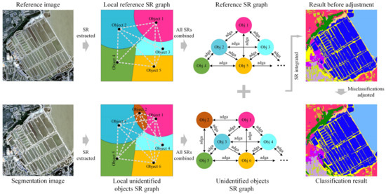 Although steps 2 to 4 in Figure 2 have achieved relatively effective classification results for HR remote sensing imagery, there are still misclassifications. Using the spatial relationships contained in the reference imagery, many misclassified objects can be adjusted accordingly. Two graphs showing the spatial relationship between objects in the reference image and segmentation image were extracted based on the types of spatial relationships described in Section 2.1. Theoretically, the objects connected by each corresponding relationship in the two spatial graphs should be the same, which was interpreted in this study as being the same class. Therefore, the classification results were checked to adjust the misclassifications by comparing each corresponding relationship in the two spatial relation graphs.