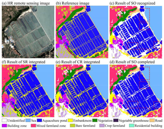 The proposed method, as mentioned in Section 2, was applied to the experimental scenes, and the experimental imagery was first segmented, as shown in Figure 9b. Then, the classification imagery was generated by recognizing and completing the significant objects and contextualizing and integrating the spatial relationships. Taking scene A as an example, we present the results obtained in each step of scene A processing, as shown in Figure 10, where Figure 10c–e, and f represent the recognition, completion, contextualization, and integration (or final classification), respectively. Significant changes in the results of each before and after processing step are indicated by dashed boxes of different colors in Figure 10. For example, the red dashed boxes and the black dashed boxes represent the significantly advanced parts of the classification results after significant object completion and spatial relation integration, respectively.