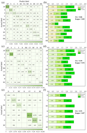 The confusion matrices (Figure 11a,c,e) were utilized to calculate the TP, TN, FP, and FN of the classification results. Figure 11a,c,e depicts the results for scenes A, B, and C, respectively. TP was represented by the diagonal lines of the confusion matrix. FP was represented as the sum of all elements in a column of the confusion matrix subtracted from the TP of this column. FN was represented as the sum of all elements in a row of the confusion matrix subtracted from the TP of this row. TN was represented as the sum of all elements of the confusion matrix subtracted from (TP+ FP + FN). Therefore, the Precision, Recall, F1-score, overall accuracy of the classification results, and kappa coefficients calculated for each class of ground objects in scenes A, B, and C are displayed in Figure 11b,d,f, respectively.