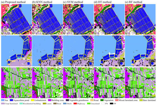 Figure 13 shows the comparison of the results of the KNN, SVM, DT, RF, and proposed methods. To better visualize the differences between the results of the five methods and the reference image, we divided the misclassified results into false negatives (FN) and false positives (FP), and the results are presented in Figure 13. Overall, we can observe that the FNs and FPs of the proposed method, DT, and RF were significantly less than those of the KNN and SVM methods. Moreover, the FNs and FPs of KNN and SVM appeared in various regions, while those values were concentrated within a small region of the imagery in the other three methods. This was especially true for the proposed method, which was the closest to the reference image with the fewest FNs and FPs (Figure 13), indicating that KNN and SVM may often misclassify ground objects more frequently than the other three methods. Specifically, the proposed method had significant advantages in object integrity extraction, especially for ground objects such as aquaculture ponds and sea areas with salient features while the objects extracted by KNN and SVM often had relatively obvious salt and pepper noise. Notably, DT and RF had the same classification performance as the proposed method due to their excellent classification ability. However, due their insensitivity to smaller objects, some detailed information will inevitably be lost in the classification process of the proposed method. For example, for the bare farmland in scene A, because of its spectral proximity to the surrounding mixed farmland zone, the UMSO algorithm easily segments the two into the same object, which will lead to the loss of classification details.