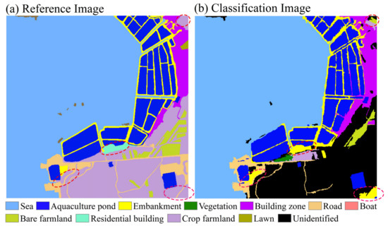 The biggest preference for using a knowledge graph for classification is that it can explore the various relationships between objects, which enables the proposed method to apply logical reasoning ability to effectively deal with smaller oversegmented objects that are quite difficult to recognize. For example, when we classified a coastal zone image, the embankments around aquaculture ponds are usually segmented by the UMSO algorithm into numerous tiny objects adjacent to each other because of their narrow shape and unremarkable spectral reflectance. Misclassification often occurs if we follow the process described in Section 2.2 and Section 2.3 for embankment object matching. Therefore, the addition of contextual relationships can adequately recognize these objects. Based on years of expert experience in remote sensing image interpretation and the relationships between ground objects in actual remote sensing images, we derived a contextual relationship: aquaculture ponds are always surrounded by embankments. Thus, unidentified contiguous adjacent tiny objects around the aquaculture ponds were recognized as embankments when they are close enough in spectrum to the embankment objects of the reference image.