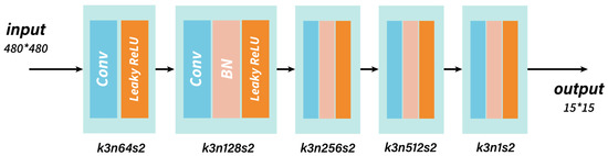 The SR model is also trained in an adversarial framework. The discriminator network employs a patchGAN discriminator, which is used in cycleGAN. The discriminator network is shown in Figure 5, and the kernel size, feature channel and the stride are shown in it. The input images are divided into several blocks that represent the discrimination result of each patch, and each picture is discriminated by the whole matrix. PatchGAN can pay attention to more areas and discriminate more accurately.