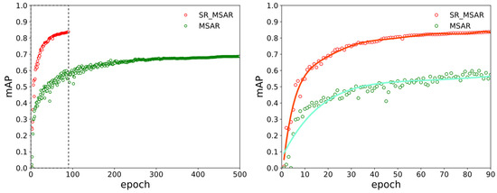 Comparison of yolov5 with and without proposed SR processing. The zoomed gray box is illustrated on the right diagram. The orange line and the cyan line are the fitted curves of the points.