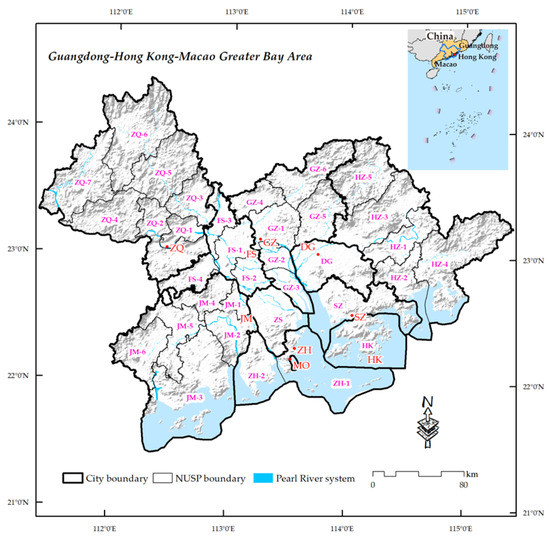 The Guangdong–Hong Kong–Macao Greater Bay Area (GHMGBA) is the region with the most complex administrative system in the world. The total land area of GHMGBA is about 5.6 × 104 km2, and it covers 9 cities on the Chinese mainland, i.e., Guangzhou (GZ), Shenzhen (SZ), Zhongshan (ZS), Huizhou (HZ), Zhuhai (ZH), Foshan (FS), Dongguan (DG), Jiangmen (JM), and Zhaoqing (ZQ), and two special administrative regions, i.e., Hong Kong (HK) and Macao (MO). At the county administrative level, there are 50 counties in the mainland cities of GHMGBA, 18 sub-regions in Hong Kong, and 5 sub-regions in Macao. These regions not only differ in size but also population and socioeconomic development. To make different administrative units comparable, this paper refers to the Nomenclature of Territorial Units for Statistics (NUTS) of the European Union (EU) and the Tertiary Planning Unit (TPU) of Hong Kong and recombines the county-level regions into 36 normative units of spatial planning (NUSP) with the consideration of their land area and urbanization levels (Figure 1) [62,63].