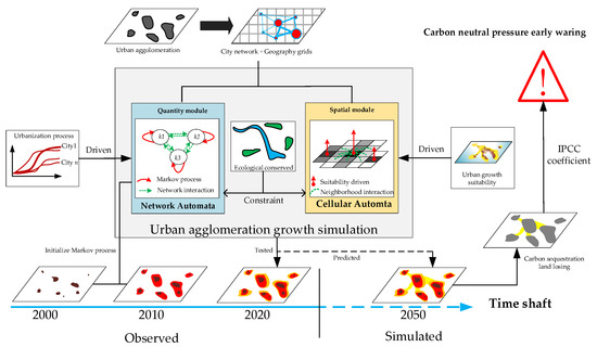 This paper proposes a framework based on urban growth modeling to provide early warnings about the carbon-neutral pressure of urban agglomerations. The framework has two core modules, the quantity module and the spatial module, to accomplish urban growth simulation and prediction for large-scale regions over a long time period. The former integrates the inertia of historical land-use change, the driving effects of the urbanization law (S-curve), and the traction of the urban agglomeration network to model the long-term quantity change of urban land in a large-scale region. The latter couples a partitioned modeling framework, spatially heterogeneous rules, and quantified land-use planning orientation to build a CA model to accurately allocate the urbanized cells in a large-scale spatial domain. These two modules are both designed to improve the ability of the land-use model to simulate urban growth on a large scale and over the long term, which are both basic characteristics of carbon-neutral planning.