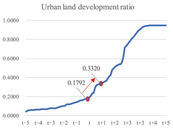 As can be seen from the construction of the network automata, nearly all the parameters can be automatically obtained from historical land-use change, except for the effects of the S-curve and the urban agglomeration network [71]. For the former, the urbanization S-curve of the GHMGBA is fitted based on its urbanization process. That is, the urban land development ratios of all the nodes in the years 2000 and 2010 are sorted into a sequence and then extrapolated to 1 according to their tendency (Figure 4). With the help of Figure 4, the application of the g function can be explained, as if the current urban land development ratio of a node is close to the S-curve value at time t (0.1792), its urban land development ratio at the next stage should be adjusted to be close to the S-curve value at time t + 1 (0.3320). Based on that, the urbanization acceleration can be obtained through the driving effect of S-curve laws, which can avoid linear urban growth.