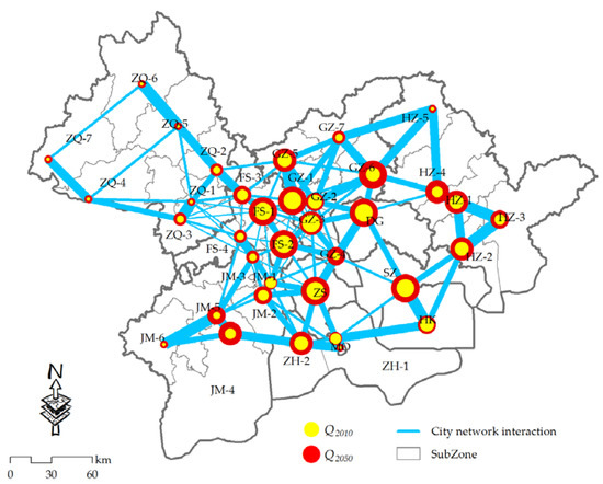 In terms of the effect of the urban agglomeration network, the Generate Spatial Weights Matrix tool in ArcGIS is used to calculate the inverse distance weights of neighboring regions on the network node n, which is used to calculate . The interaction network between the nodes in the GHMGBA in 2050 is obtained after 4 iterations and shown in Figure 5. In Figure 5, the yellow circle represents the urban land quantity in 2010, while the red circle represents that in 2050. All the circles have been proportionally processed to be comparable. The larger the circle radius is, the larger the urban land quantity should be, and the greater the difference between red and yellow circles is, the larger the urban growth quantity should be. On the contrary, minor differences between red and yellow circles denote that urban growth is reaching its limit or has no more potential. The blue lines in Figure 5 represent the interaction intensity between network nodes; the thicker the line is, the stronger the synchronization between two nodes and the stronger the effect of the urban agglomeration network on the node should be.