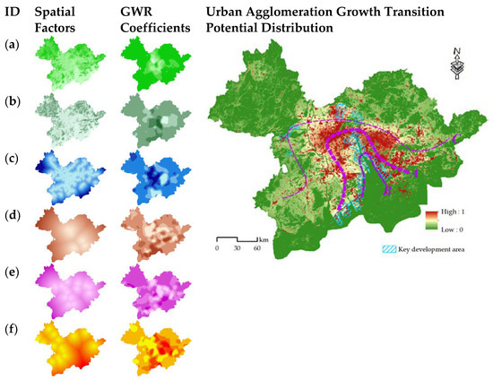 Urban agglomeration growth transition potential distribution estimated by GWR modeling. (a) elevation, (b) slope, (c) distance to the main canal (the Pearl River), (d) distance to the core nodes (Guangzhou, Shenzhen, Hong Kong, and Macao), (e) distance to several important nodes, and (f) distance to other nodes.