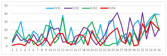 The prediction accuracy of the network automata model has been tested before applying it to predict urban land quantity. Four prediction models are established to investigate the performance of the proposed network automata model, including (1) ErS1: urban growth is driven by the historical inertia of 2000–2010; (2) ErS2: urban growth is driven by the historical inertia of 2000–2010 and the S-curve of urbanization; (3) ErS3: urban growth is driven by the historical inertia of 2000–2010 and the effects of urban agglomeration network; and (4) ErS4: urban growth is driven by the three factors, i.e., the proposed network automata. With the four models, the urban land quantity of 36 sub-regions in 2020 has been simulated and is compared to the observation in 2020 to show their errors (Figure 7). Ideally, if the model can perfectly predict the urban land quantity of each sub-region, the error line should be a straight line with a value of 0. As can be seen from Figure 7, the error lines of the four models are fluctuant, and their mean error rates are 17.39%, 15.82%, 12.86%, and 9.83%, respectively. The results show that the proposed network automata model has the best performance in predicting urban land quantity, and its error rate is less than 10%, which means that it is more reliable than the other models in predicting urban land quantity and can be used to predict the urban land quantity of each sub-region in 2050.