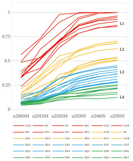 Urban land development ratio in each sub-region from 2020 to 2050. L1, L2, L3, and L4 denote the four levels of land development ratio.