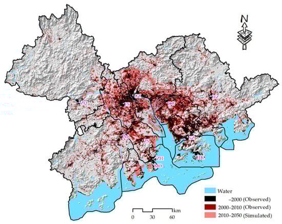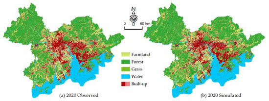 Based on predicted urban land quantity growth, urbanized cells can be spatially allocated through the spatial module, i.e., the CA model, to complete the urban agglomeration growth simulation. The simulation performance of the CA model is detected through the kappa index (Kappa) and figure of merit (FoM); the former measures the quantity consistency between two maps, while the latter measures the change consistency. Based on simulated and observed land-use maps in 2020 (Figure 9), the Kappa of simulated urban land is calculated to be 0.4416, which seems to be not high enough. This is because Kappa is easily affected by the proportion of urban land to the total area, and urban land accounts for a small percentage of the GHMGBA [61,73]. FoM is relatively better than Kappa in terms of reflecting the simulation performance as it focuses on the urban land change in the simulated and actual urban growth [74]. It is obtained by calculating the ratio of intersection and union of simulated and observed urban growth and is 0.2926 in this study, which is satisfactory and indicates the good performance of urban growth modeling.