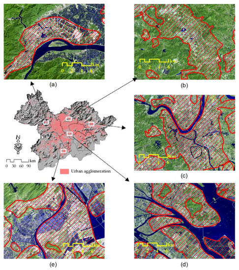 The CA model is used to predict the future land-use patterns in the GHMGBA in 2050 (Figure 10) after testing the capability of the CA model to simulate urban growth. As can be seen from Figure 10, depending on the key development areas prescribed in the “Development Plan for the GHMGBA”, the urban land patches of the GHMGBA will be evenly distributed in 2050 and gradually form an obvious “Ω” structure, which can be confirmed by the significant development of western sub-regions. Furthermore, five location cases are selected to verify the effectiveness of predicted land-use patterns, including (a) the development zone in Zhaoqing, (b) Sino-Singapore Guangzhou Knowledge City, (c) the central urban area of Huizhou, (d) the Nansha Development Zone in Guangzhou, and (e) the Doumen district of Zhuhai. The five locations in the predicted map (2050) are enlarged in Figure 11 and compared with the base map, which is the latest high-resolution satellite image of 2020. The comparison shows that road networks or bulldozed ground happen almost in all of these locations, indicating they are experiencing the urbanization process. These findings indicate that the proposed framework has a good ability to predict the urban development of the GHMGBA. This is because the network automata can reconstruct the development mode of the urban agglomeration. Although the effect of this reconstruction cannot be observed in the short term (e.g., urban land-use change from 2010–2020), it would make a significant difference in long-term prediction when combined with government planning.