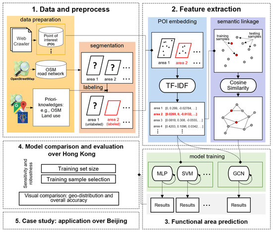 In this study, first, the basic study unit (i.e., functional area) is designed in Hong Kong, according to urban road networks, to obtain a relatively more homogeneous functional property (see [36,42]), followed by data-labeling on the basic study unit, which is the process of identifying raw data and adding meaningful labels to provide context for machine learning. After applying the supervised and semi-supervised ML models to achieve the urban functional area classification, the models’ performances, in terms of uncertainty, robustness and sensitivity, will be compared to give insights into model selection strategies for different scenarios. The resulted insights are further supported by a case study carried out in Beijing.