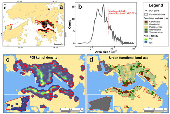 (a) Geographical setting of the study region, Hong Kong, China. The research is carried out within the red lines; (b) histogram statistics of the size for the functional area; (c) kernel density distribution of Point of Interest (POI) points; and (d) the functional land use distribution derived from the dataset of Land Utilization in Hong Kong (LUHK), including five categories: commercial, residential, public service, recreational and transportation.