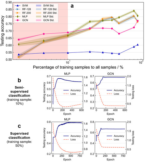 - All models are tested five times with the same amount and combination of training data for monitoring model stability by calculating the standard deviations (Std.) of the result accuracies (see the colored shadows in Figure 3a). SVM and GCN reveal better model stability (smaller Std.), compared with RF and MLP. As the model stability of MLP depends on the number of training data, it shows high instability with a small number of training data, but it improves (and become even better than RF) with a large number of training data.