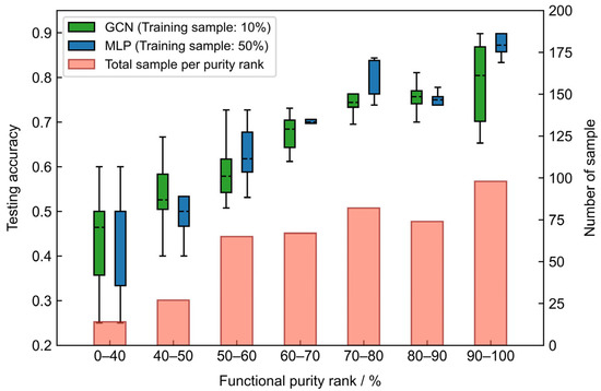 To study the impact of the functional heterogeneity inside areas on the classification accuracy, 5 training sets, each consisting of 10%, are selected out of all samples (using the same stratified sampling method in Section 3.1.3) to train the GCN, and another 5, each consisting of 50% samples, are generated similarly to train the MLP. The occupation percentage of the labeled class (or purity) is calculated for the remaining 90% and 50% samples, based on the same method described in Section 2.1. The purity values are then segmented with an equal interval of 10% to form different purity ranks. The trained models are applied on those samples to observe the relationship between the accuracy and the purity rank. The results are plotted together with a frequency distribution of samples per purity rank in Figure 5.