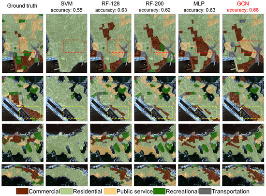 Unlike traditional machine learning (e.g., SVM, RF, MLP) lacking consideration of graph structured semantic linkage, graph-based models have the potential to predict urban land use types with a small number of training data, which is meaningful in the real-world prediction. This could be achieved via measuring the semantic linkages or their similarity distances, etc. [27]. The requirements of training data are largely reduced for these models compared to others, i.e., they could be trained in a semi-supervised manner.