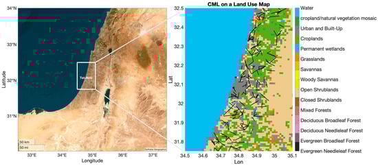 Here, we have focused on the larger Tel Aviv Metropolitan area, including the city of Netanya in the north and Ashdod in the south (Figure 1, 34.6–35.3E, 31.6–32.58N). Most of the study area is a low plain lying between the Mediterranean Sea in the west and the Judea–Samaria mountains to the east. This region is characterized by different LCs such as: urban areas, vegetation, agriculture, highways, airports, and industrial areas, etc. The proximity to the sea has a significant impact on the humidity values, which are often high next to the coastline and decrease eastward. Weather stations located close to the sea usually show high absolute humidity values that may represent a very small area on seashore and thus are not suitable for comparison with the links that are inland. Large differences were observed at stations that are located 5 km or further from the coastline (Figure S1). This might be related to local factors such as land cover.