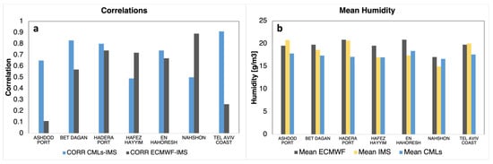 (a): Correlations between the CMLs and the reanalysis from the ECMWF (ERA5) and the Israeli Meteorological Service (IMS). (b): Mean absolute humidity values in [g/m3] from the CMLs, ECMWF (ERA5), and the IMS. All results refer to observations made during July 2017 of one instantaneous measurement at 3 am. Detailed information and additional results can be found in Table S1.