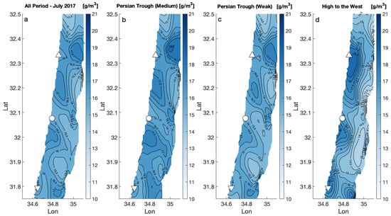 Average humidity maps for the whole period during July 2017 (a) and for three synoptic conditions: medium Persian Trough (b), weak Persian Trough (c), and High to the West (d). Maps (b–d) show the interpolated humidity fields based on 10 km radius of interpolation. White circles denote the coastal cities of Tel Aviv; white triangles are the coastal cities of Netanya (upward) and Ashdod (downward).