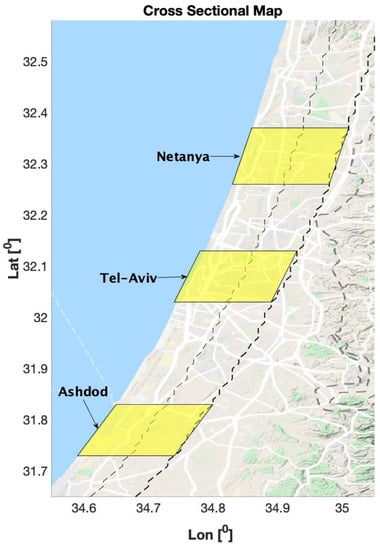 The boundaries of the strips representing the area on which the cross-sectional averages were drawn in Figure 6 are shown. Two NE–SW strips along the coast (dashed line) and three W–E strips around the three cities, Netanya, Tel-Aviv, and Ashdod (yellow parallelograms), are plotted.