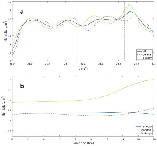 In summary, for the wider strip (0–18 km, Figure 6a), Tel Aviv’s latitude (32.06 N) has lower mean humidity values than northern and southern latitudes nearby, since Tel Aviv occupies the full zone of the wide strip (blue line, Figure 6a). However, in both Netanya and Ashdod the wider strip shows a peak because of the aforementioned LC reasons. There is a significant humidity increase near Netanya due to the agriculture activity in the east, while the increase near Ashdod occurs due to the city effect in the west.