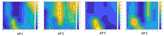 (2) The Wi-Fi wireless network gradually covers most of the indoor areas. Using the existing Wi-Fi infrastructure for positioning is a low-cost and lightweight solution. Traditional RSS fingerprinting is one of the most popular positioning methods. Usually, Wi-Fi RSS data are used to build a radio map, and online real-time matching is used to obtain a rough location. Figure 2 shows the signal strength distribution of the four APs (access points) in the test area, which can generally be used to distinguish geographic locations. However, it will lead to large localization errors due to low spatial resolution.