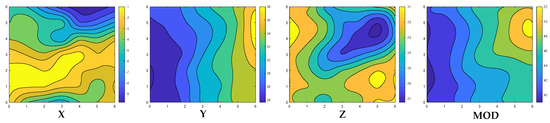 (3) The ubiquitous geo-magnetic field is a potential indoor positioning technology that does not depend on infrastructure. There are several ways to locate it using geomagnetic information. One is to use magnetic field information to calculate the heading, which is usually used in a PDR algorithm. However, it is easy to be affected by building materials, and the estimation accuracy is not high. On the contrary, another method is to use the magnetic field anomaly as a unique feature to distinguish different indoor areas or indoor and outdoor areas, and its advantages are low cost and low energy consumption. However, the degree of discrimination of geomagnetic signals is limited, and it is difficult to achieve high-precision indoor positioning. It is experimentally confirmed in [33] that the influence of moving objects is very limited, with almost no influence at a distance of one meter. Moreover, although there are differences in the data collected by different devices and different device orientations, the shape of the data curve on the same path is the same, so the method of subtracting the mean is usually used for preprocessing to achieve data standardization. As shown in Figure 3, the spatial distribution differences of the X, Y, Z axes and modulus of the geomagnetic field are plotted, which shows that it has a certain ability to distinguish locations.