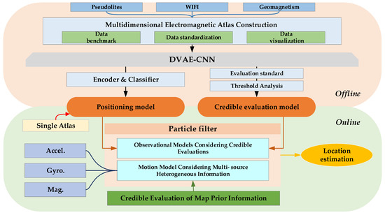 The technical route of the proposed algorithm is shown in Figure 4. The realization of the positioning algorithm includes two parts: the offline stage and the online stage. The offline stage includes the acquisition and processing of multi-dimensional electromagnetic data, as well as the construction and training of feature models and locators, and then packaged into lightweight models that can be used in engineering applications. The online stage includes two parts: calling the model and real-time positioning. The credible evaluation model, the locator model, the MEMS sensor information and the prior geographic information are fused through the particle filter algorithm to achieve rapid positioning in the indoor building environment.