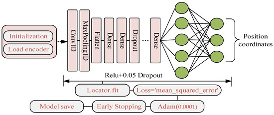 Each feature map is then sub-sampled by max pooling, and the weight w is iteratively updated using the backpropagation algorithm to reduce the loss function between the initial prediction (estimated class) and the label (true class). Gradient descent is the most common first-order optimization algorithm in machine learning and deep learning, and RMSProp and Adam are gradient-based first-order optimizations for stochastic objective function algorithms. In this paper, Adam is selected as the final optimizer according to the actual training effect, and the one-dimensional feature vector is obtained and passed to the FC (fully connected layer), and the position coordinates are estimated through Relu. The locator model architecture is shown in Figure 9.