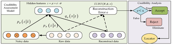 , the distribution can be fitted by building a neural network, is the input data, the mean is and the variance is as the output of the neural network, where and are the parameters of the encoder and decoder, respectively, and the second term on the right side of the equation represents the reconstruction error as , so Equation (5) can be written as: