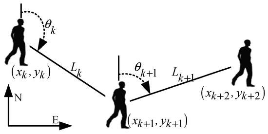 (b) In the target position prediction stage, the PDR algorithm in Equation (12) based on the terminal MEMS sensor is used as the state transition equation of the particle to realize the prediction of the particle position. The schematic diagram of the algorithm is shown in Figure 12: