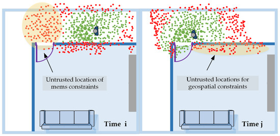 (e) In the trusted position estimation stage, the possible positions of the particles are superposed according to the weight value to obtain the final estimated result. The schematic diagram of the trusted evaluation mechanism based on heterogeneous information is shown in Figure 13, where the red dot is an untrustworthy location and the green dot is a possible location at the next time.